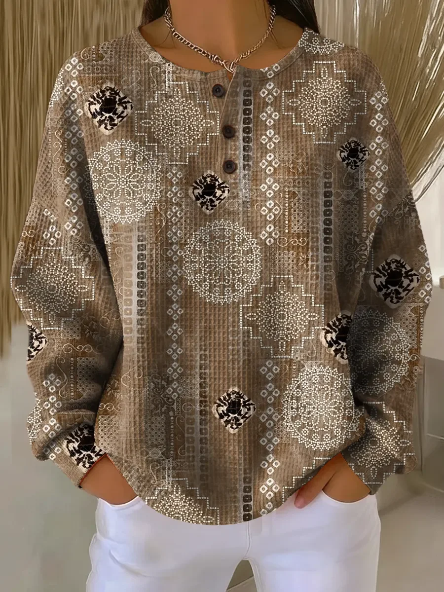 Women's Abstract Print Button-Up Casual Waffle Knit Sweatshirt