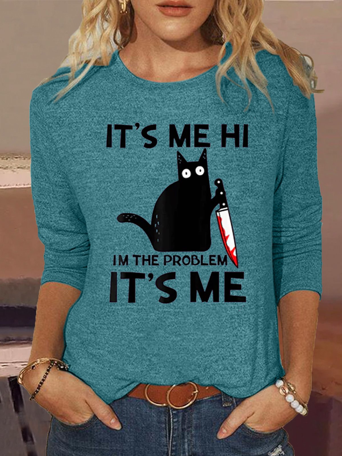 Women's Funny It's Me Letter Cat Print Crew Neck Casual Shirt