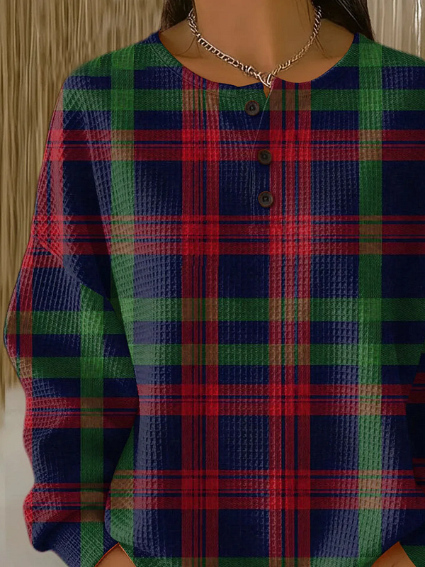 Women's Plaid Print Button-Up Casual Waffle Knit Sweatshirt