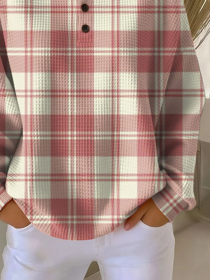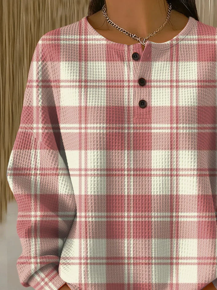 Women's Plaid Print Button-Up Casual Waffle Knit Sweatshirt