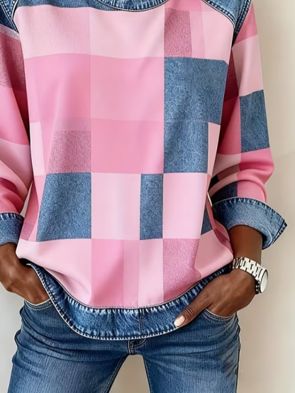 Women's Plaid Print Patchwork Denim Crewneck Long-Sleeved Sweatshirt