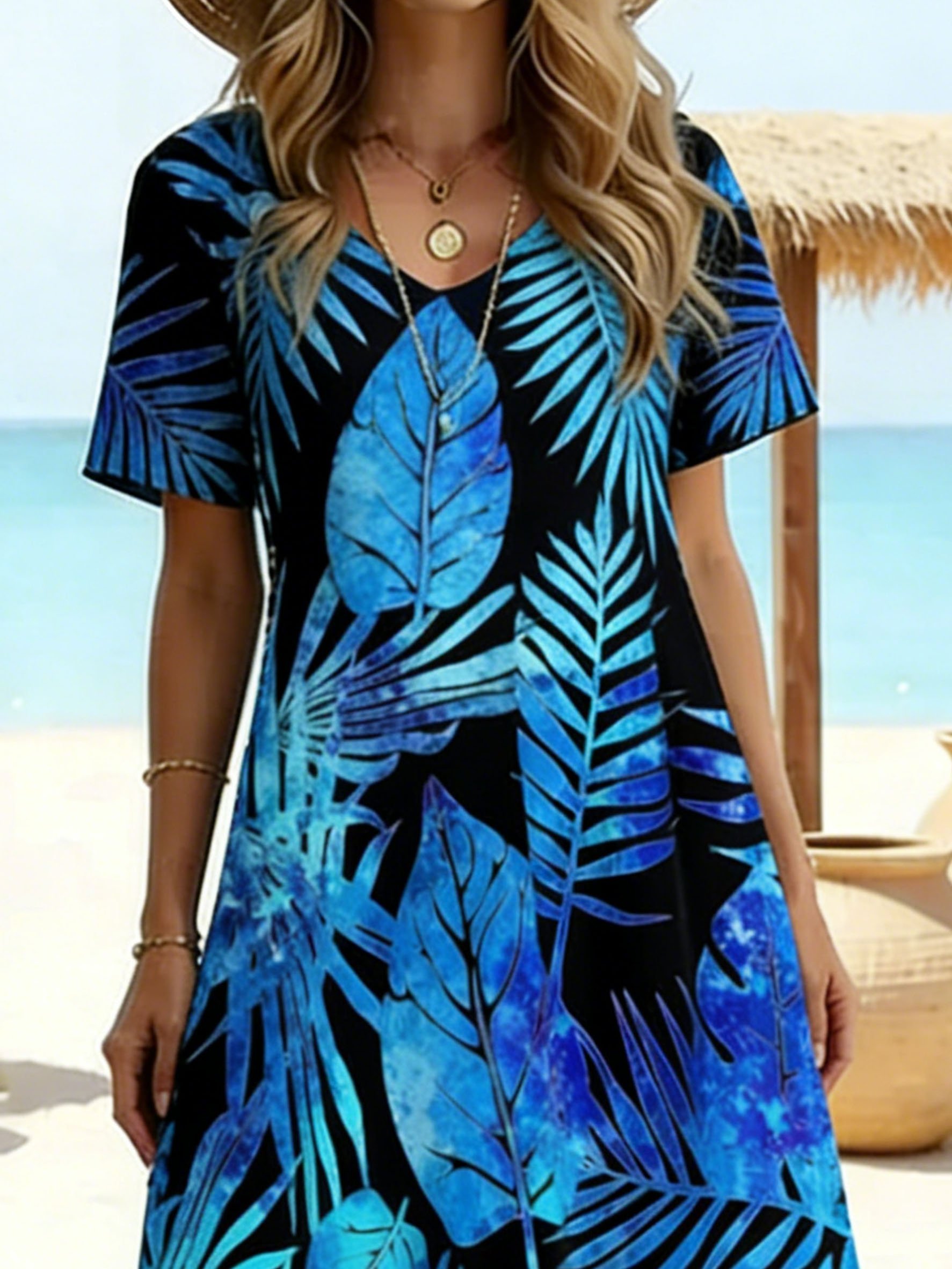 Women's Short Sleeve Summer As Picture Tropical Printed V Neck Short Sleeve Daily Going Out Casual Maxi A-Line T-Shirt Dress