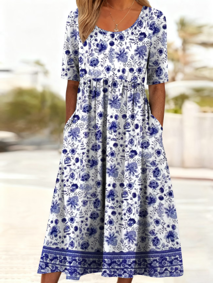 Women's Short Sleeve Summer Blue Floral Printing Crew Neck Daily Going Out Casual Maxi H-Line Shift Dress Dress