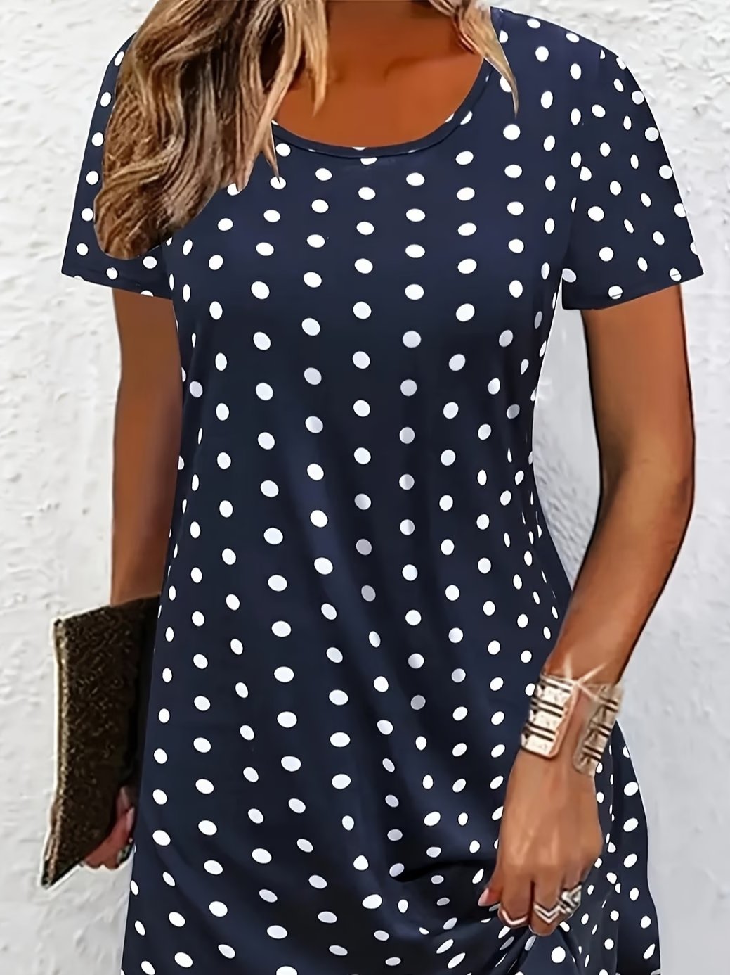 Women's Short Sleeve Summer Navyblue Polka Dots Printing Crew Neck Daily Going Out Casual Midi A-Line T-Shirt Dress Dress