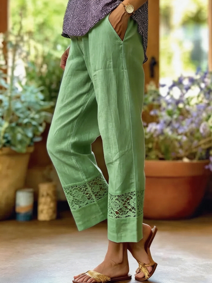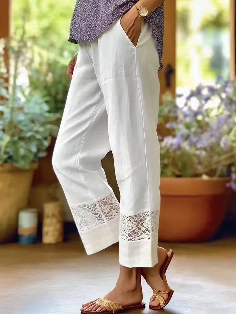 Elegant Cotton Lace Patchwork Mid Waist Casual Ankle Pants