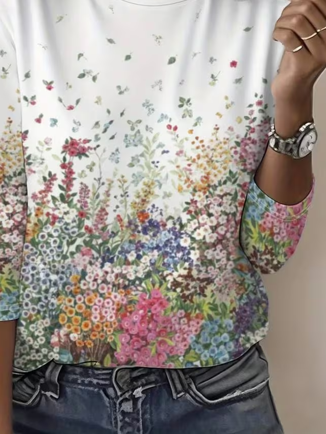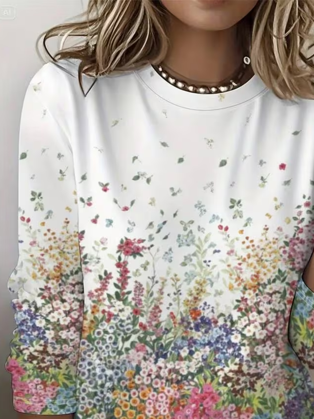 Women's Long Sleeve T-shirt Spring/Fall White Floral Printing Jersey Crew Neck Daily Going Out Casual Top