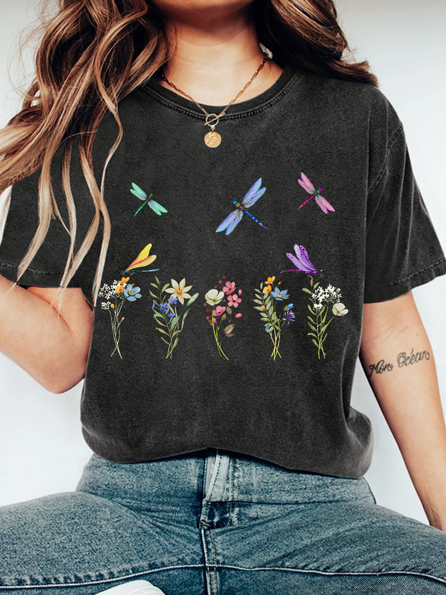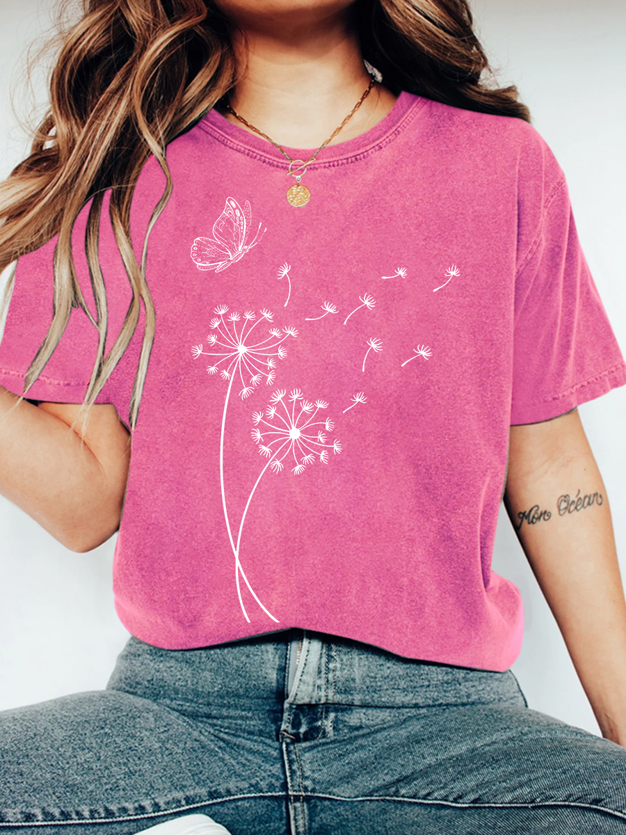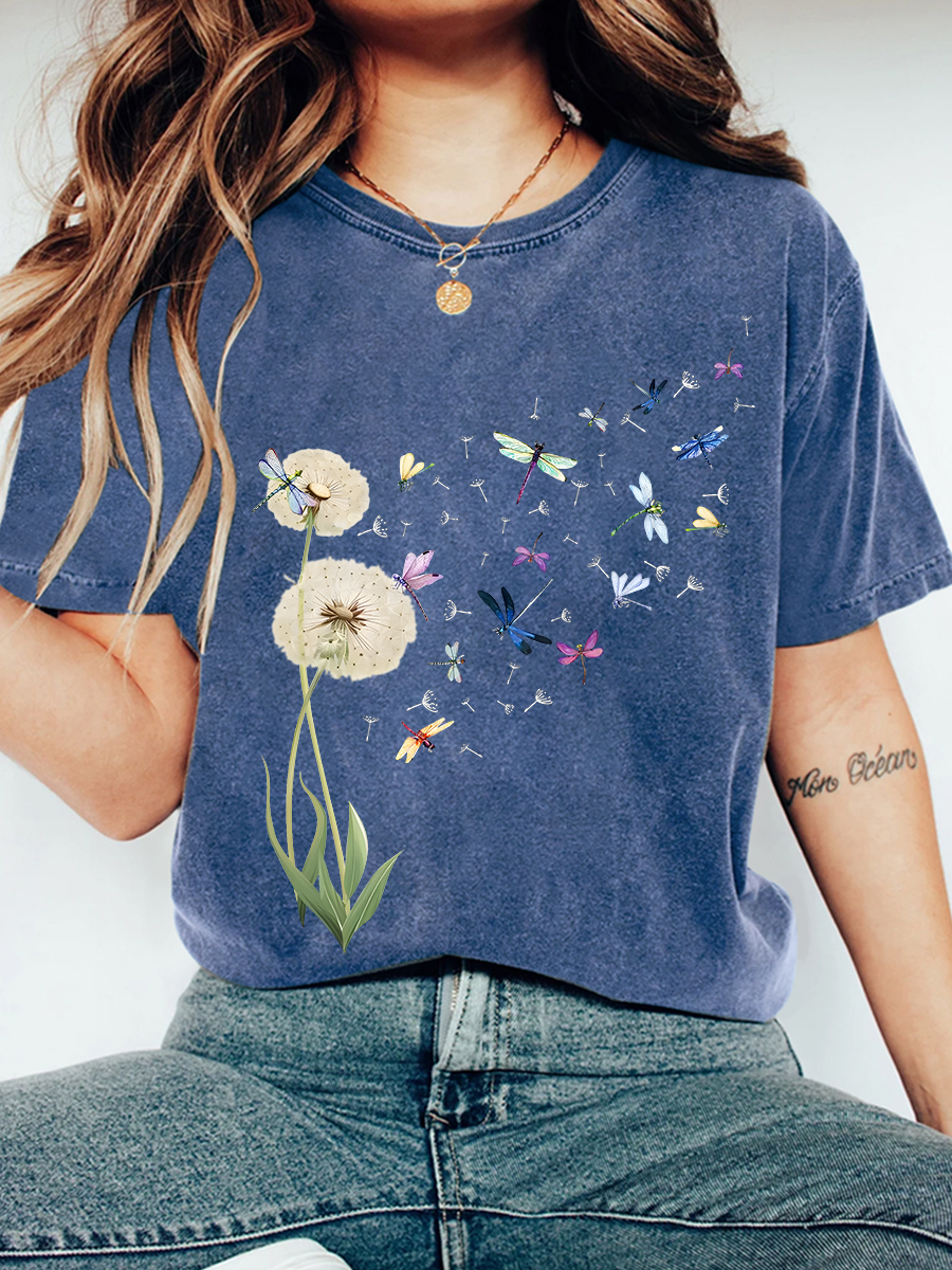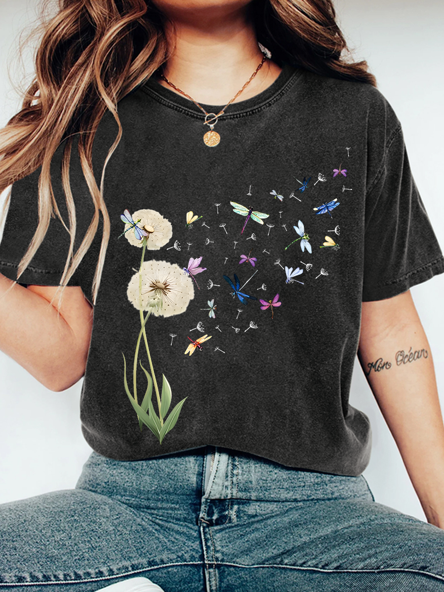 Women's Dandelion Dog Cute Print Vintage Washed T-shirt
