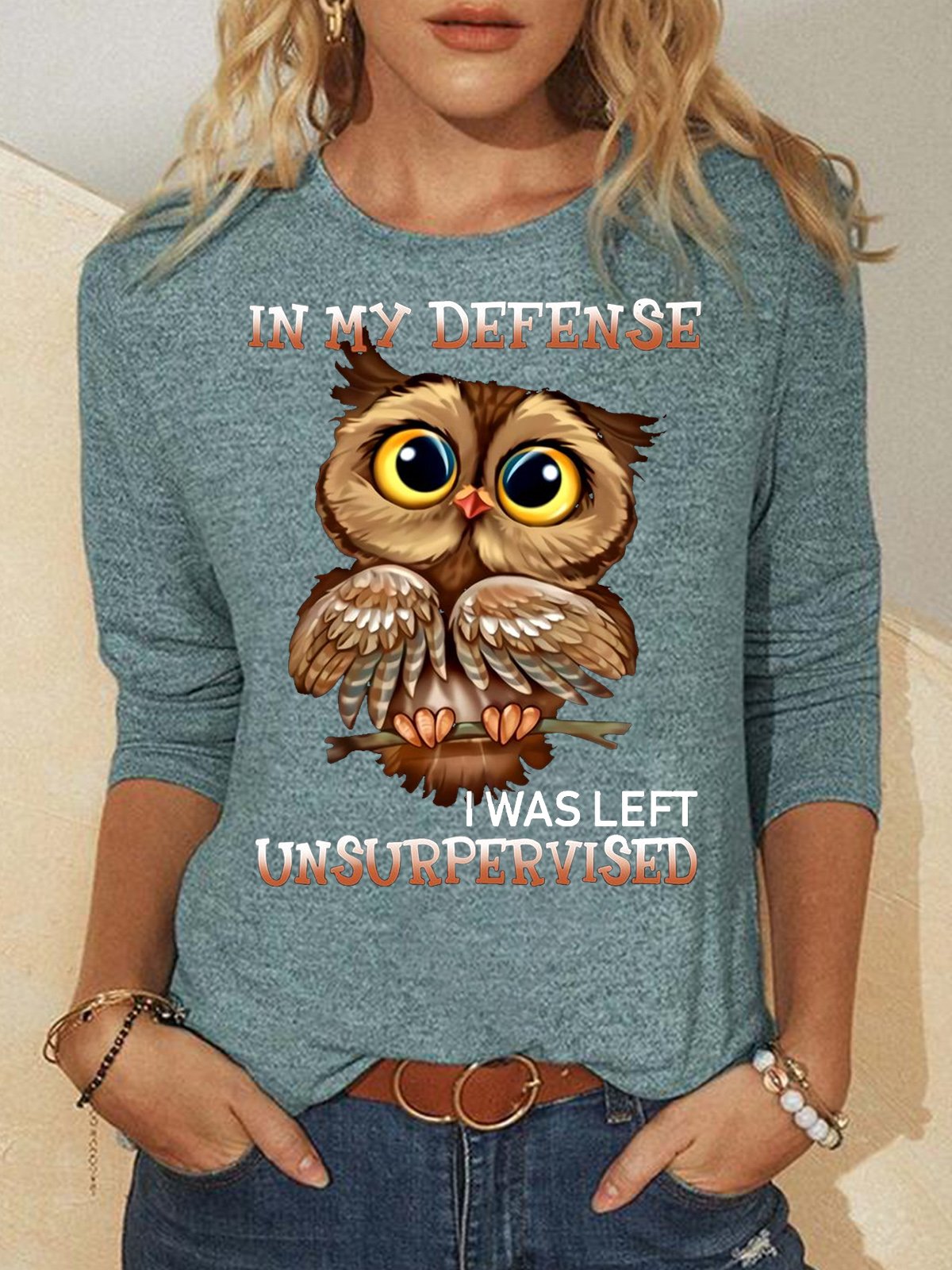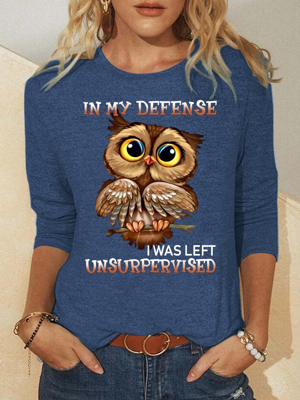 Women's funny Casual Owl In My Defense I Was Left Unsupervised Letters Top