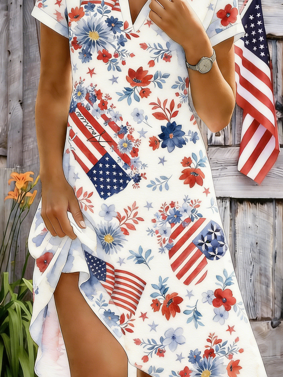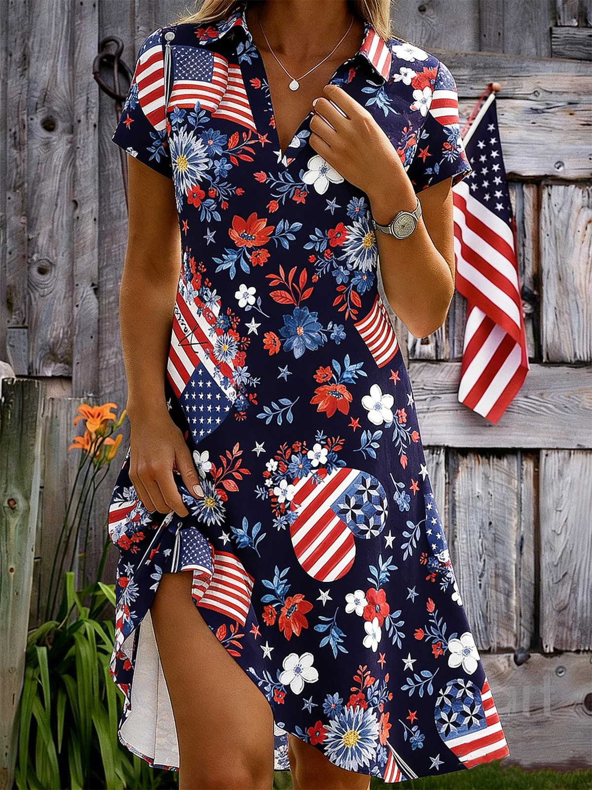 Elegant Independence Day Loose Shawl Collar Shirt Dress With No