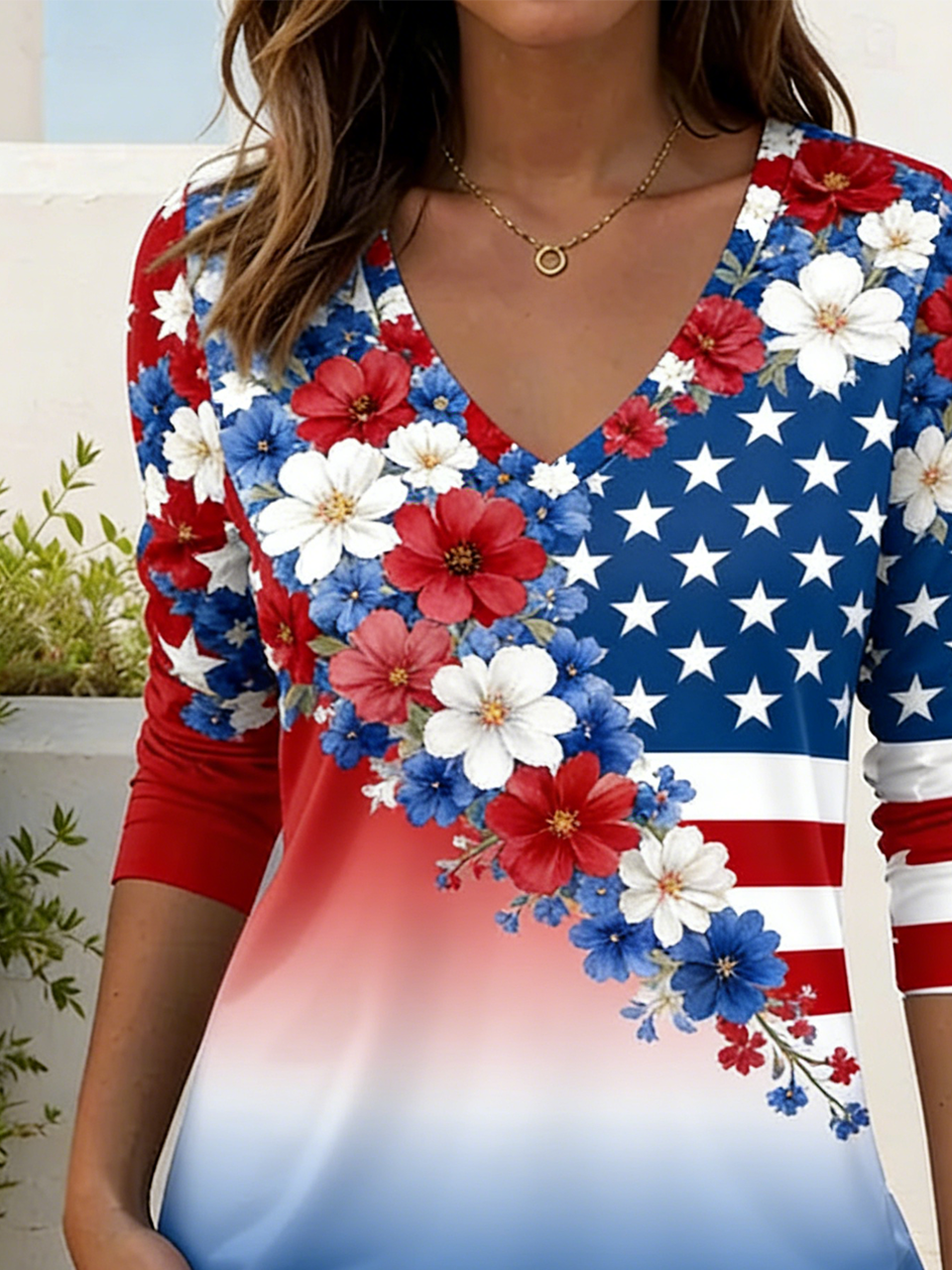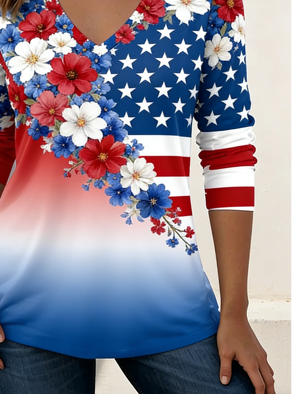 Loose Independence Day V Neck Elegant T-Shirt