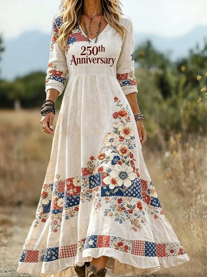 Women America Flag Spring Summer Dress Floral V Neck A-Line 250th Anniversary Letter Pattern Vintage Maxi Dress