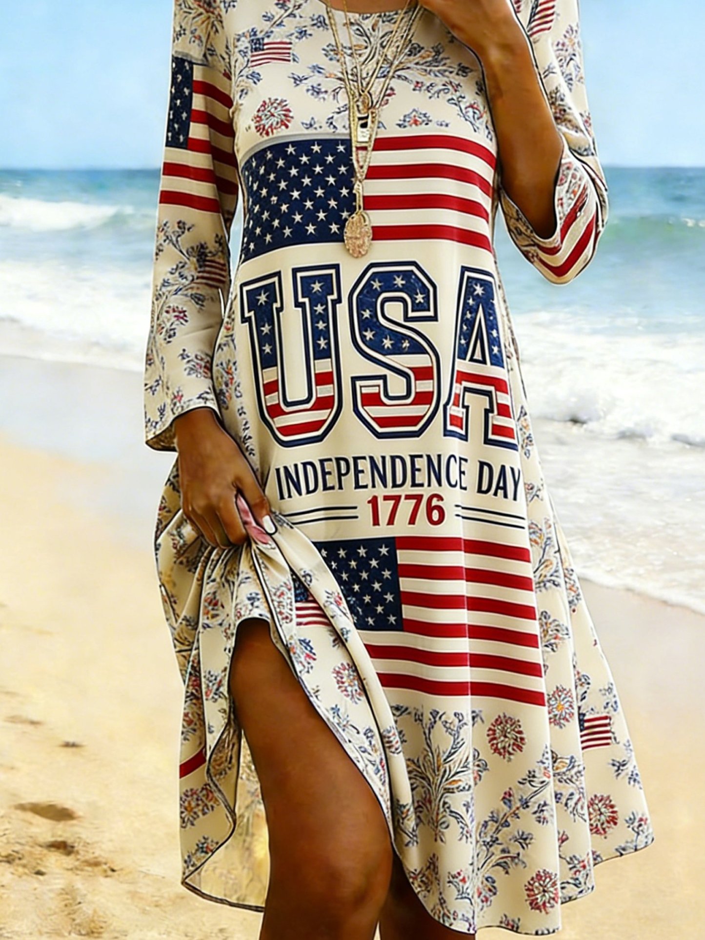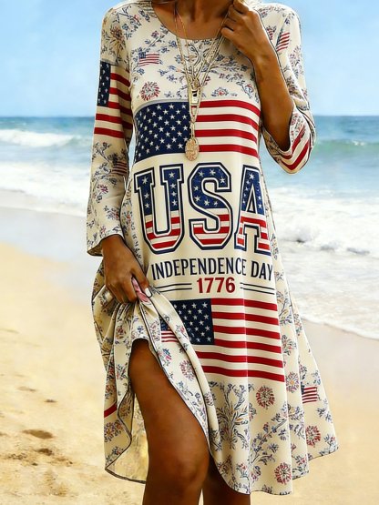 Women Floral Summer Dress America Flag Crew Neck 250th Anniversary Dress