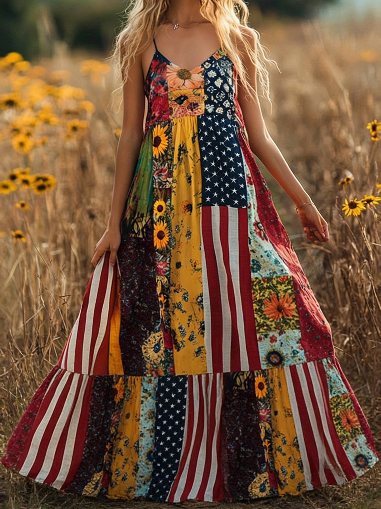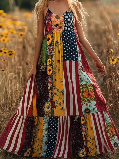 Women Floral Summer Dress America Flag Linen Look V Neck Sleeveless A-Line Dress