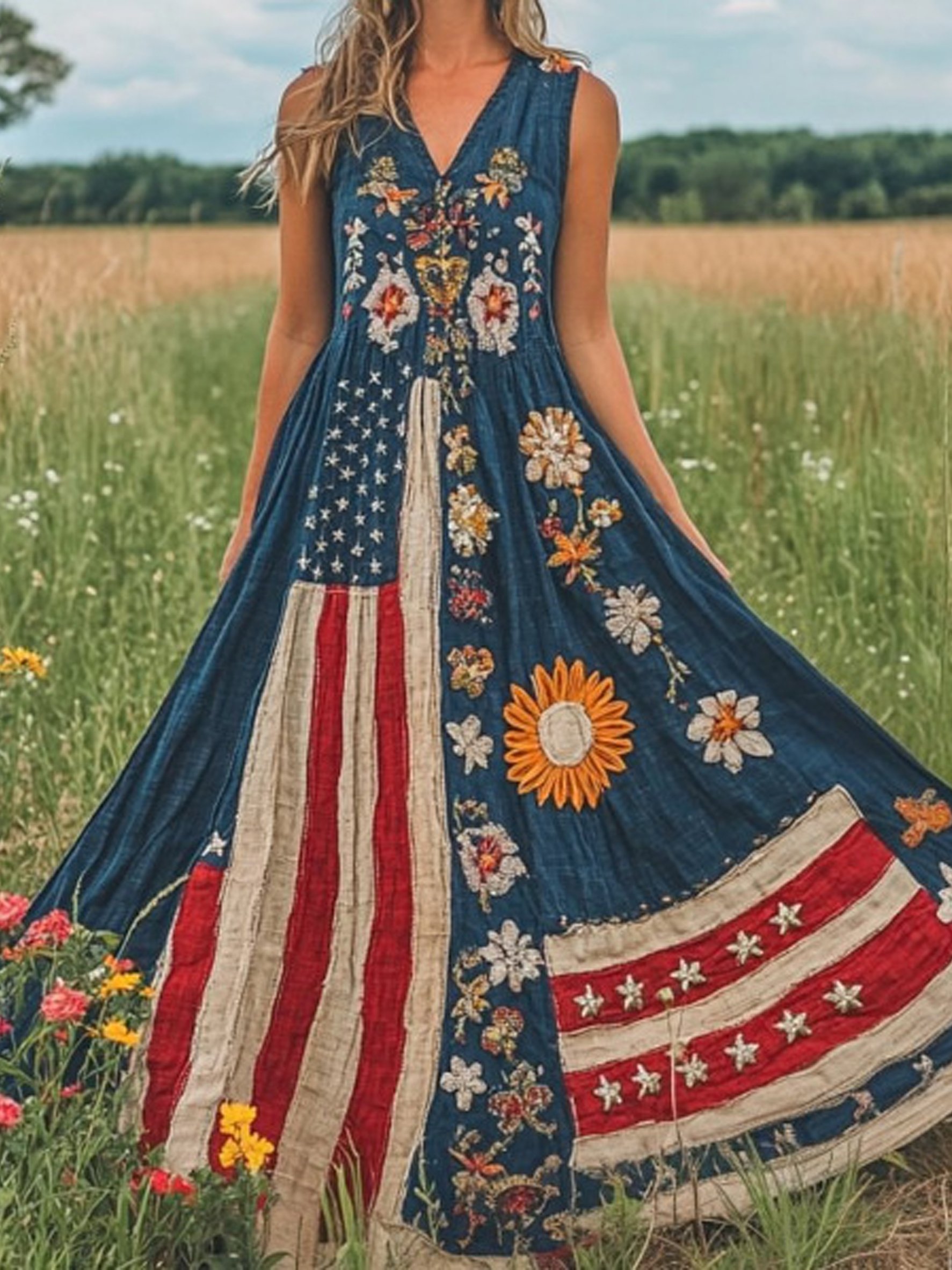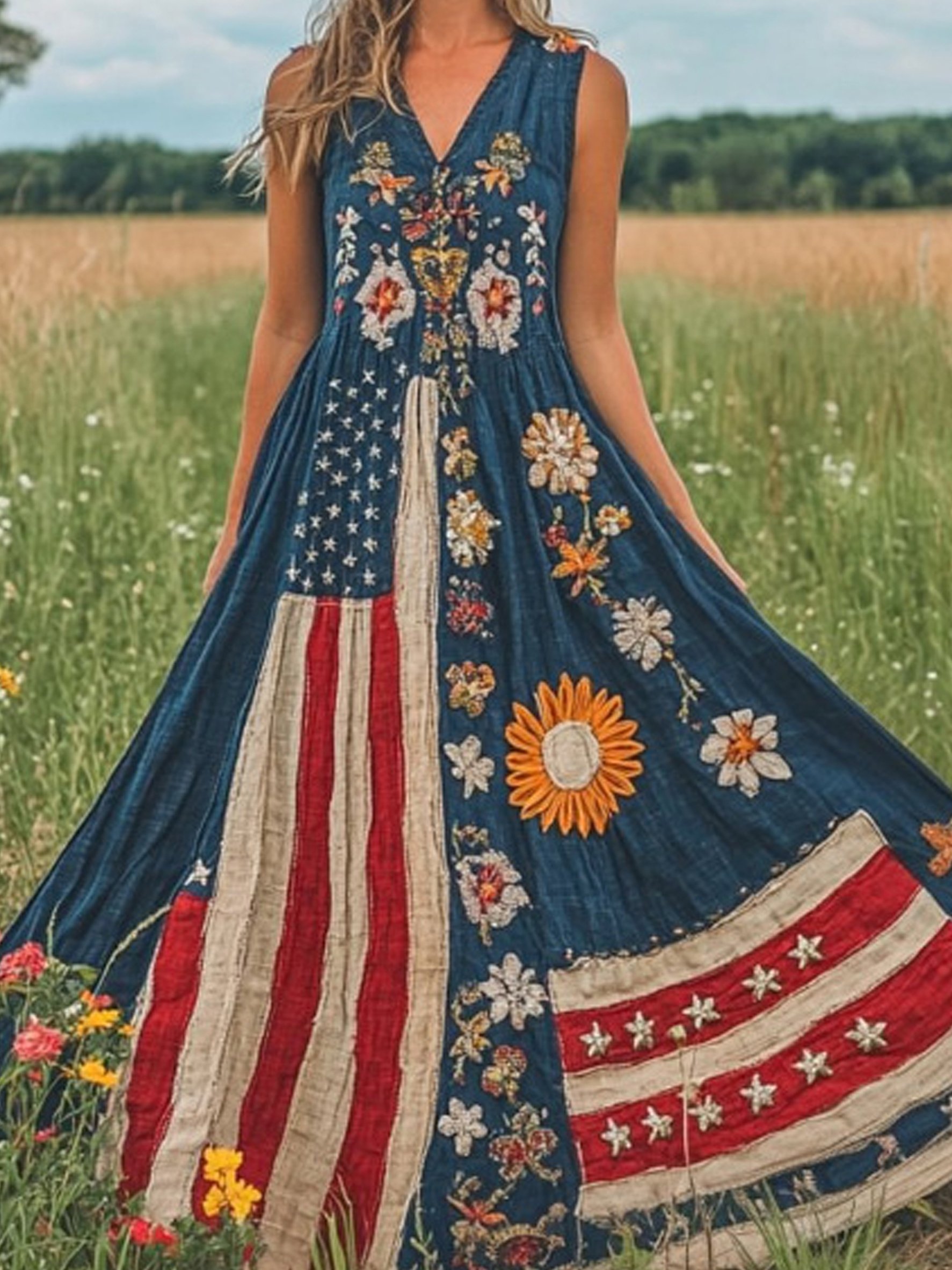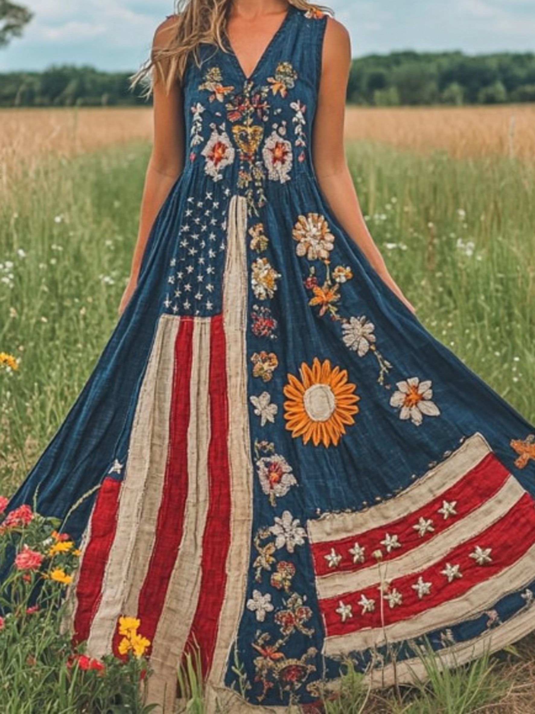 Women Floral Summer Dress America Flag V Neck Sleeveless A-Line Dress