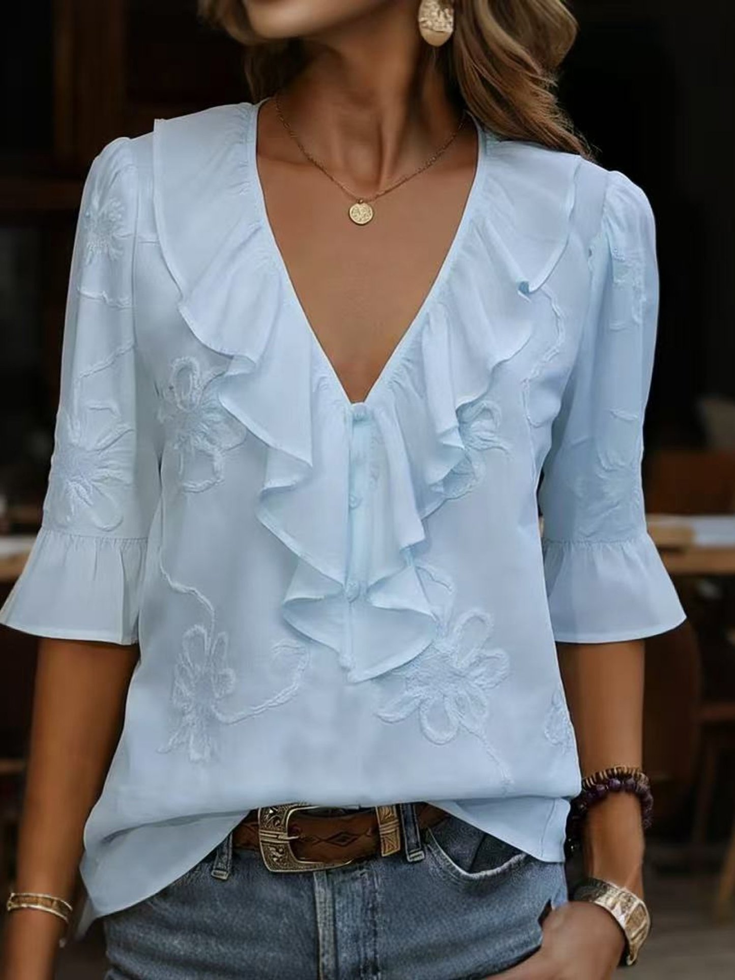 Women Ruffle V Neck The Quarter Sleeve Embroidery Patterns Spring Summer Going Out Elegant Blouse