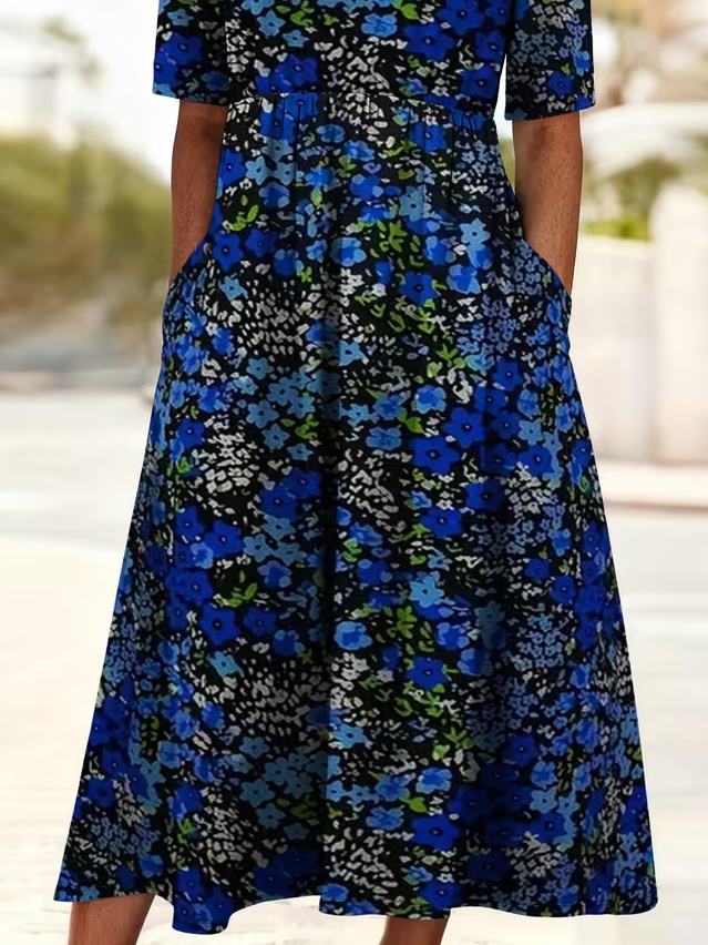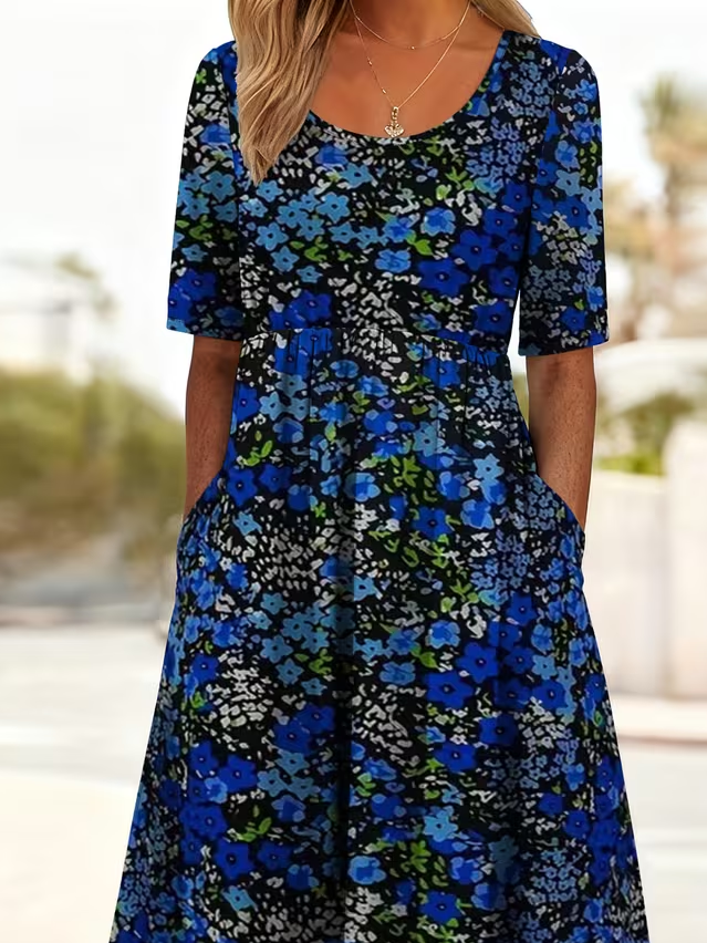 Women's Short Sleeve Summer Blue Floral Printing Crew Neck Daily Going Out Casual Maxi H-Line Shift Dress Dress