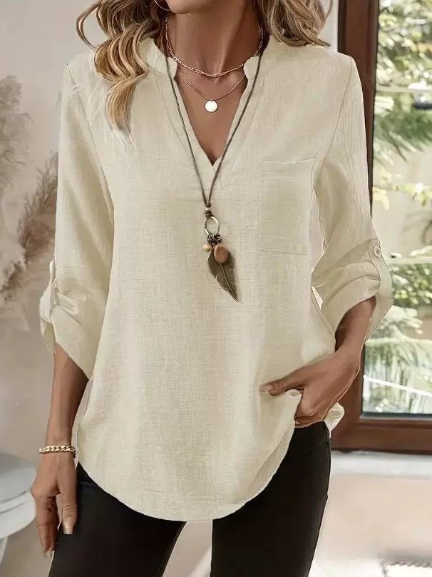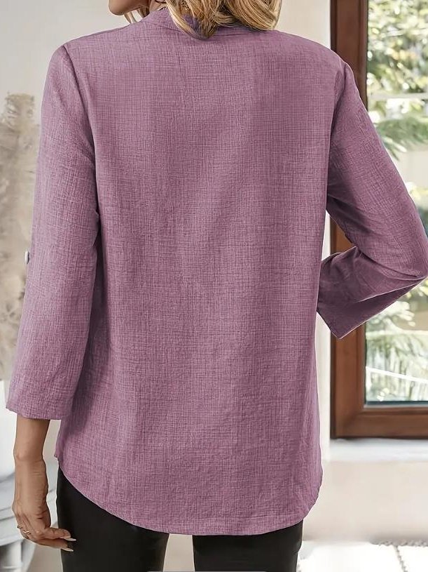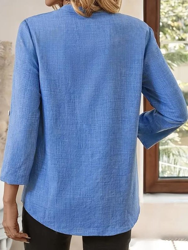 Women's Three Quarter Sleeve Shirt Spring/Fall Green Plain Split Joint Cotton And Linen V Neck Daily Going Out Casual Top
