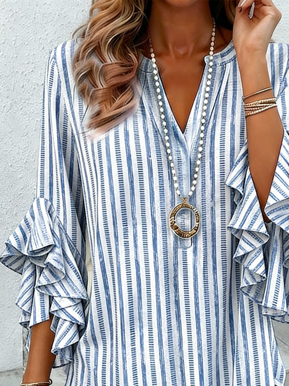 Long Sleeve Blouse V-Neck Solid Color Shirt with Ruffle Detail