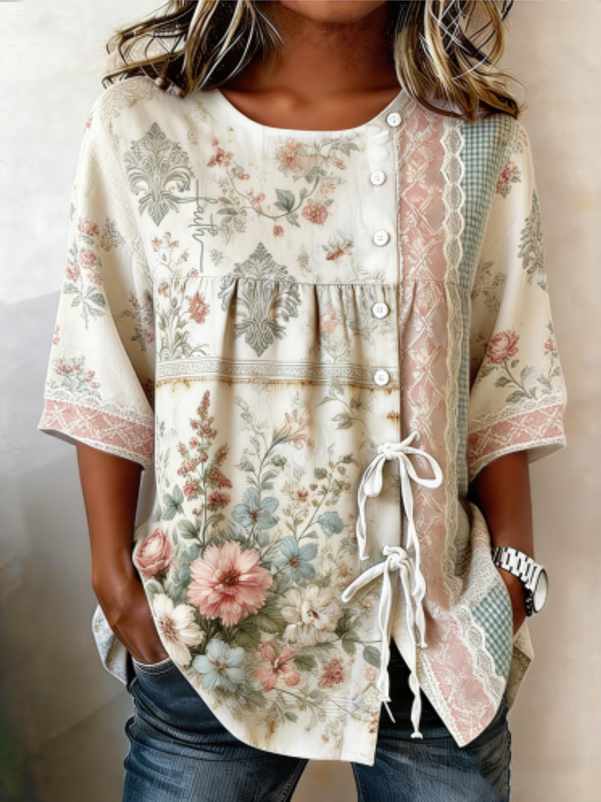 Casual Floral Three Quarter V Neck Printed Top