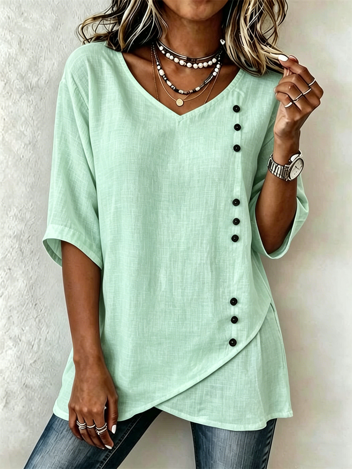 Polyester Cotton V Neck Short Sleeve Casual Blouse