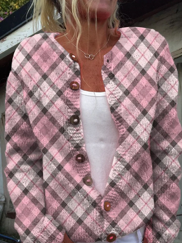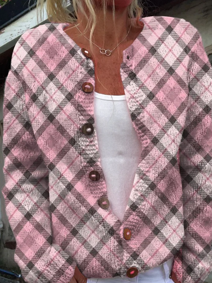 3D Printing Plaid Color Block Casual Crew Neck Cardigan