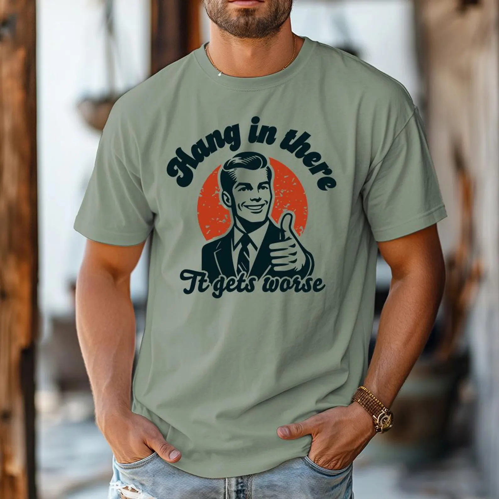 Men's Hang In There It Gets Worse Sarcastic Funny Slang Short Sleeve T-shirt