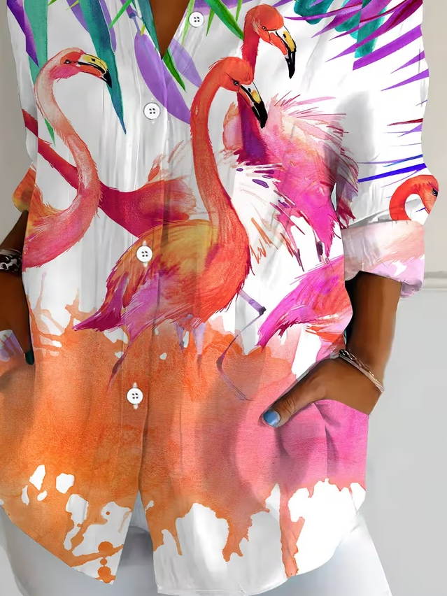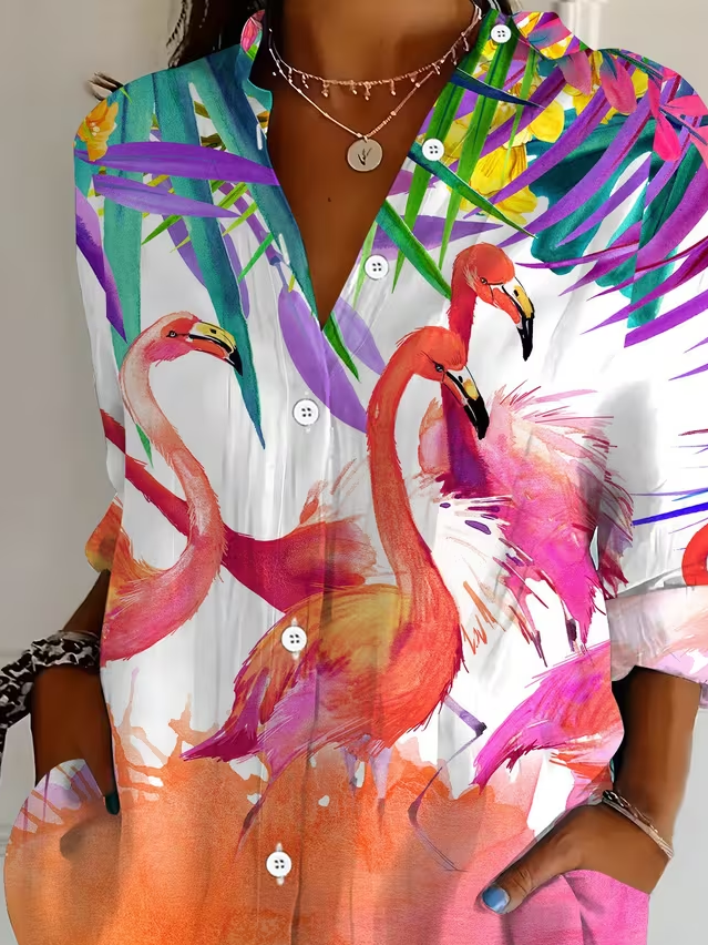 Women's Long Sleeve Shirt Spring/Fall As Picture Flamingo Buckle Shirt Collar Regular Sleeve Daily Going Out Casual Top