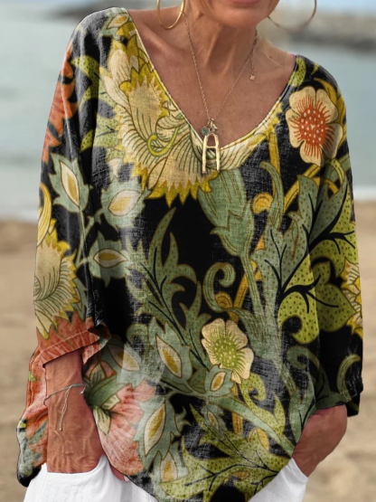 Women's Vintage Flowers and Plants Print Casual V-neck Long Sleeve Comfortable Cotton T-shirt