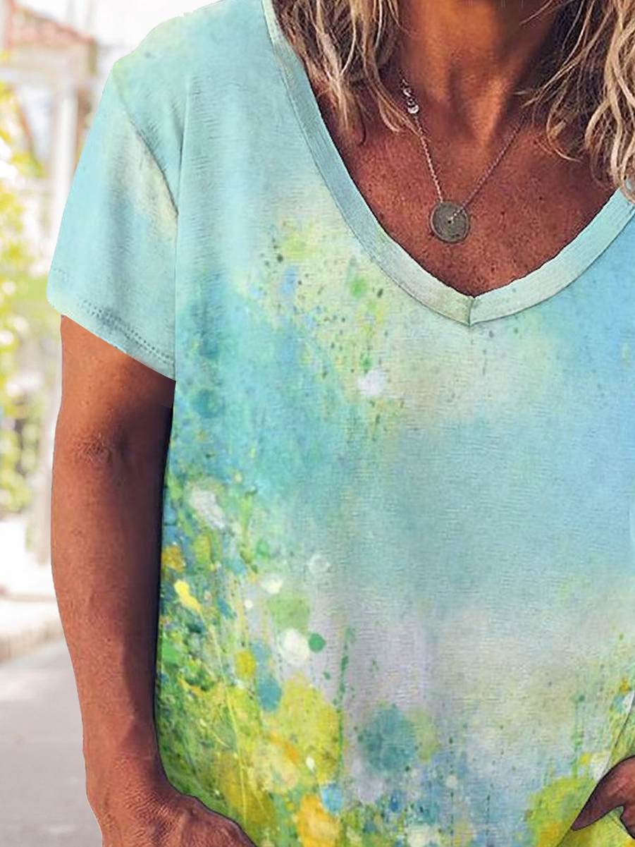 Gradient Abstract Print V-Neck Short Sleeve T-Shirt