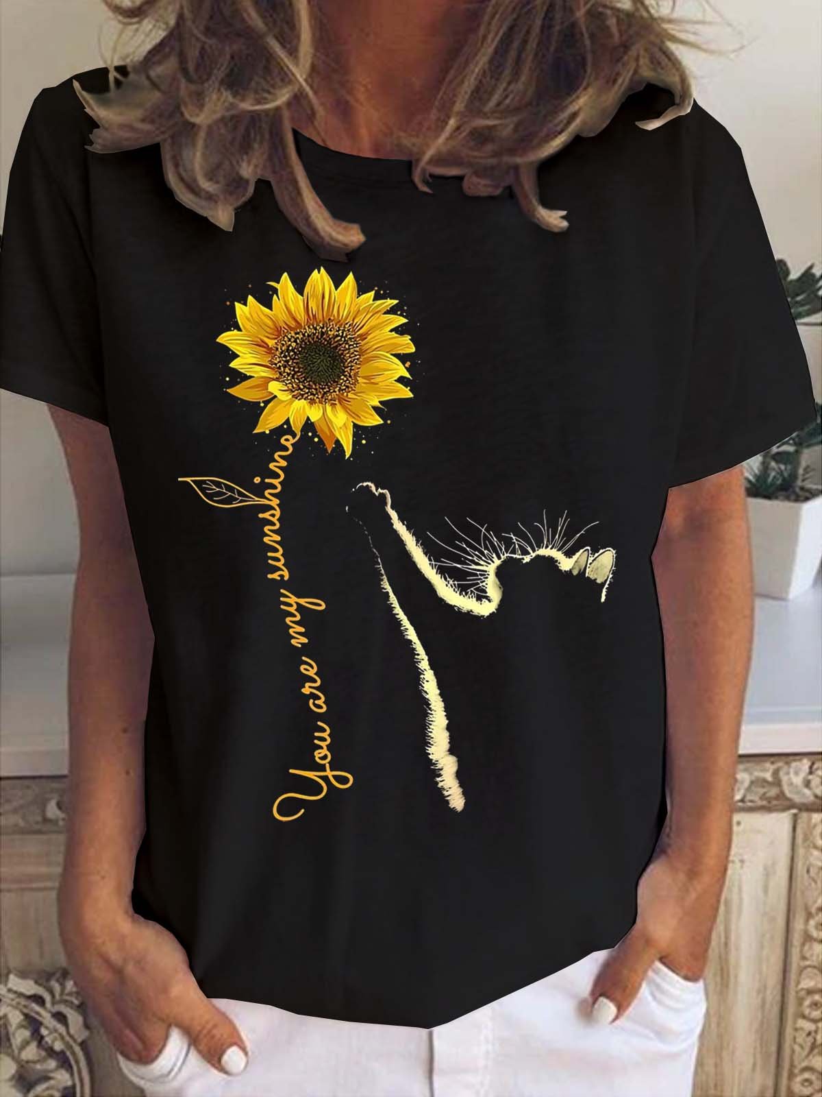 Sunflower Cat You Are My Sunshine Crew Neck Casual Short sleeve tops