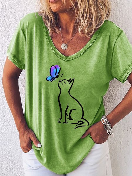 Butterfly Cat Print V-Neck Short Sleeve T-Shirt