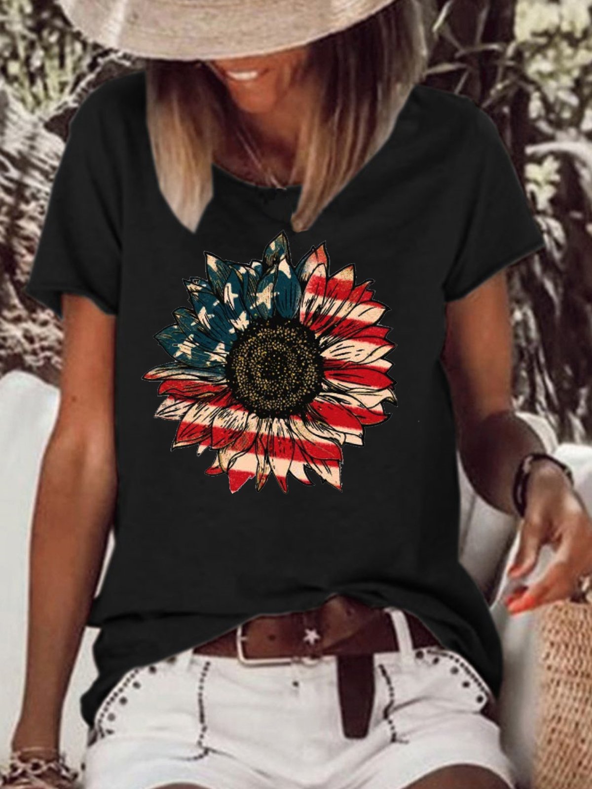 American Flag Gradient Print V-Neck Short Sleeve T-Shirt