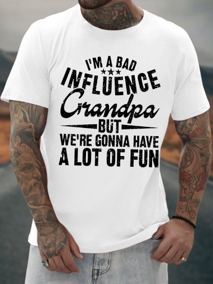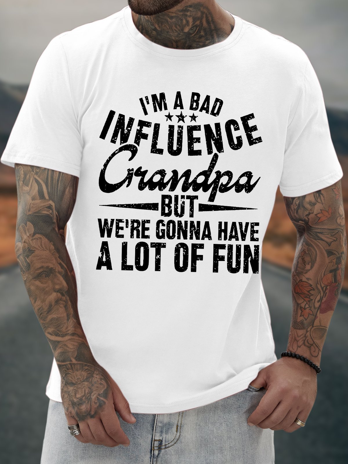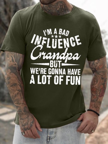 Men's Funny I Am A Bad Influence Grandpa But We Are Gonna Have A Lot Of Fun Graphic Printing Crew Neck Casual Cotton Text Letters T-Shirt