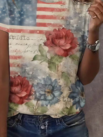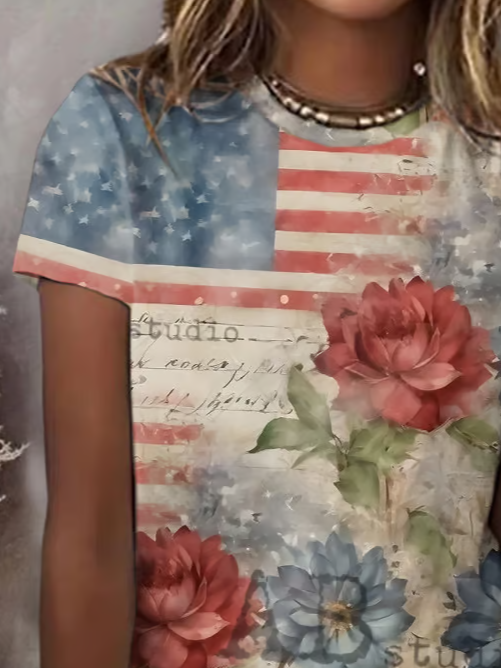 Women's Independence Day Floral Print Casual Crew Neck Short Sleeve T-Shirt