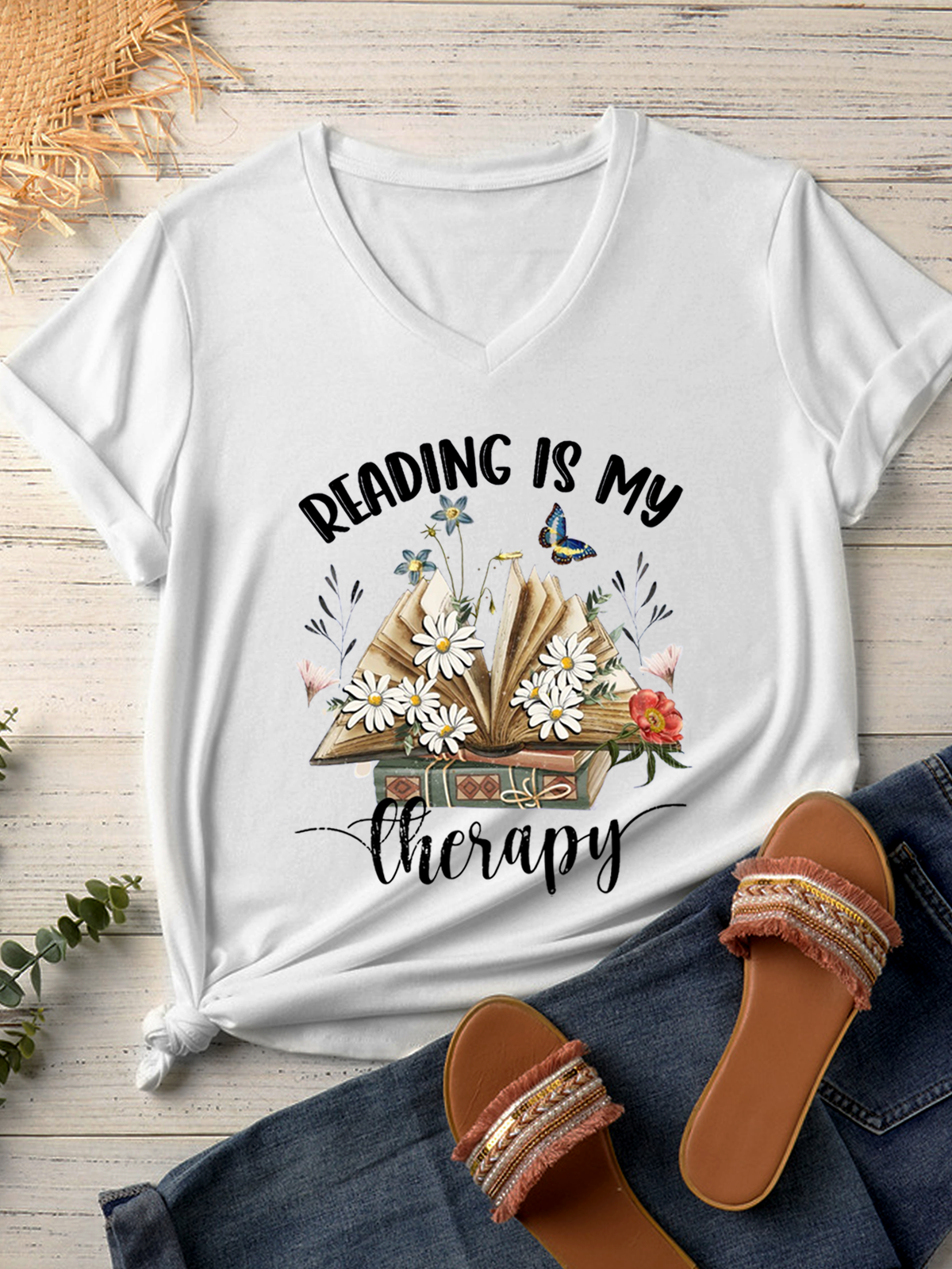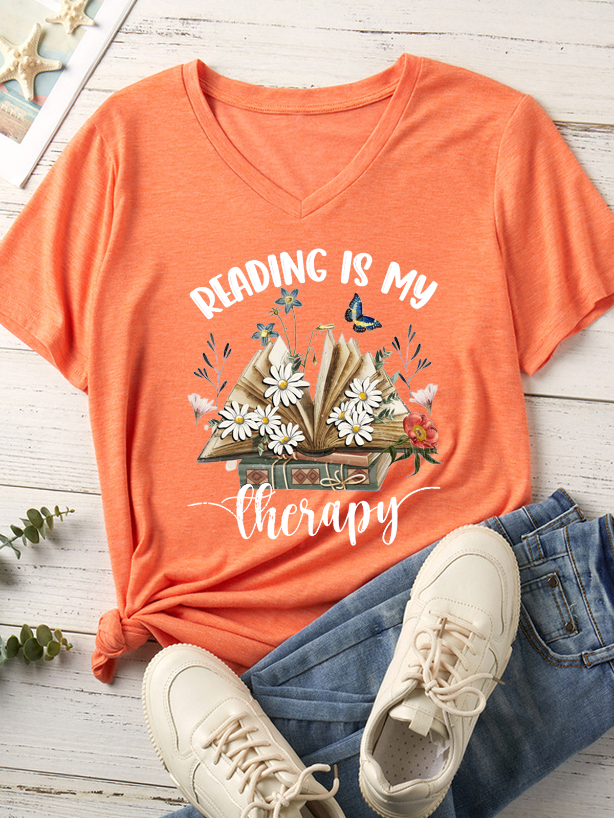 Women's Reading Is My Therapy V Neck Casual Text Letters T-Shirt