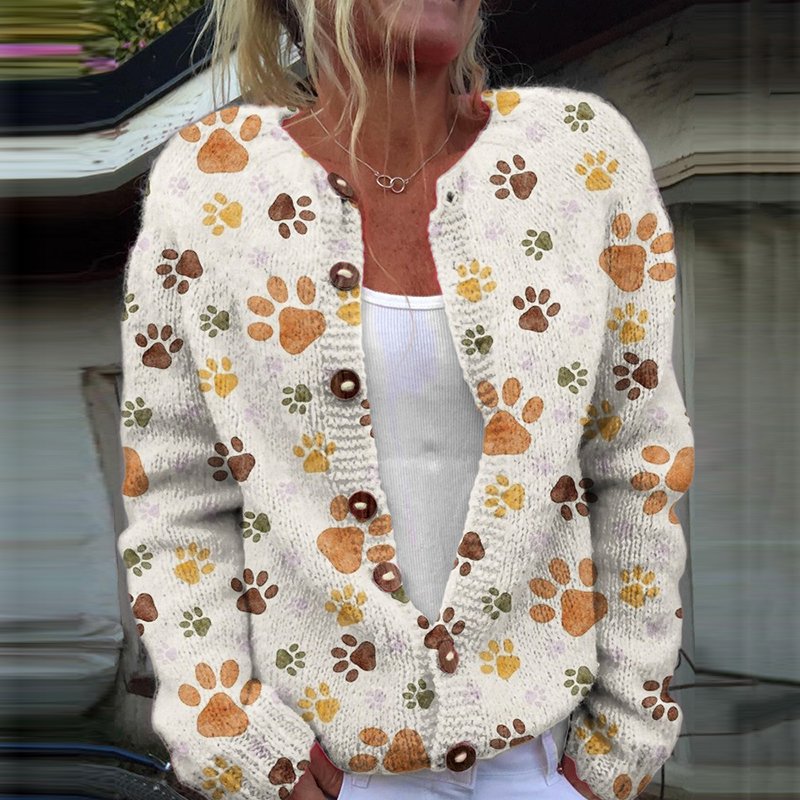 Dog paw print casual button knit cardigan