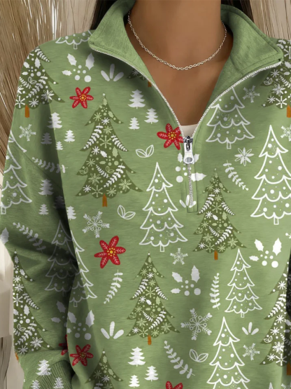 Shawl Collar Zipper Christmas Tree Casual Sweatshirt