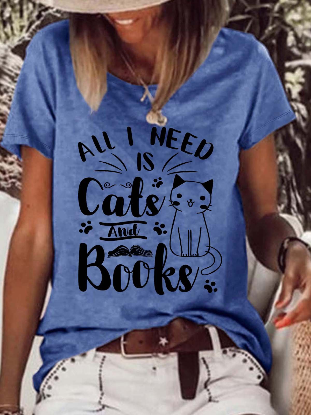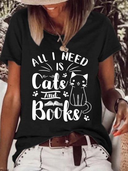 Women’s All I Need Is Cats And Books Loose Crew Neck Casual T-Shirt
