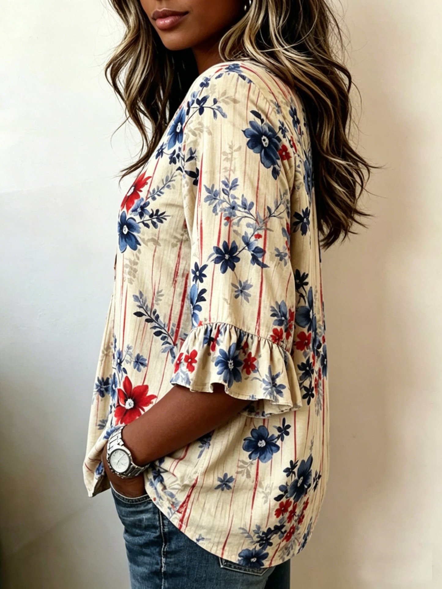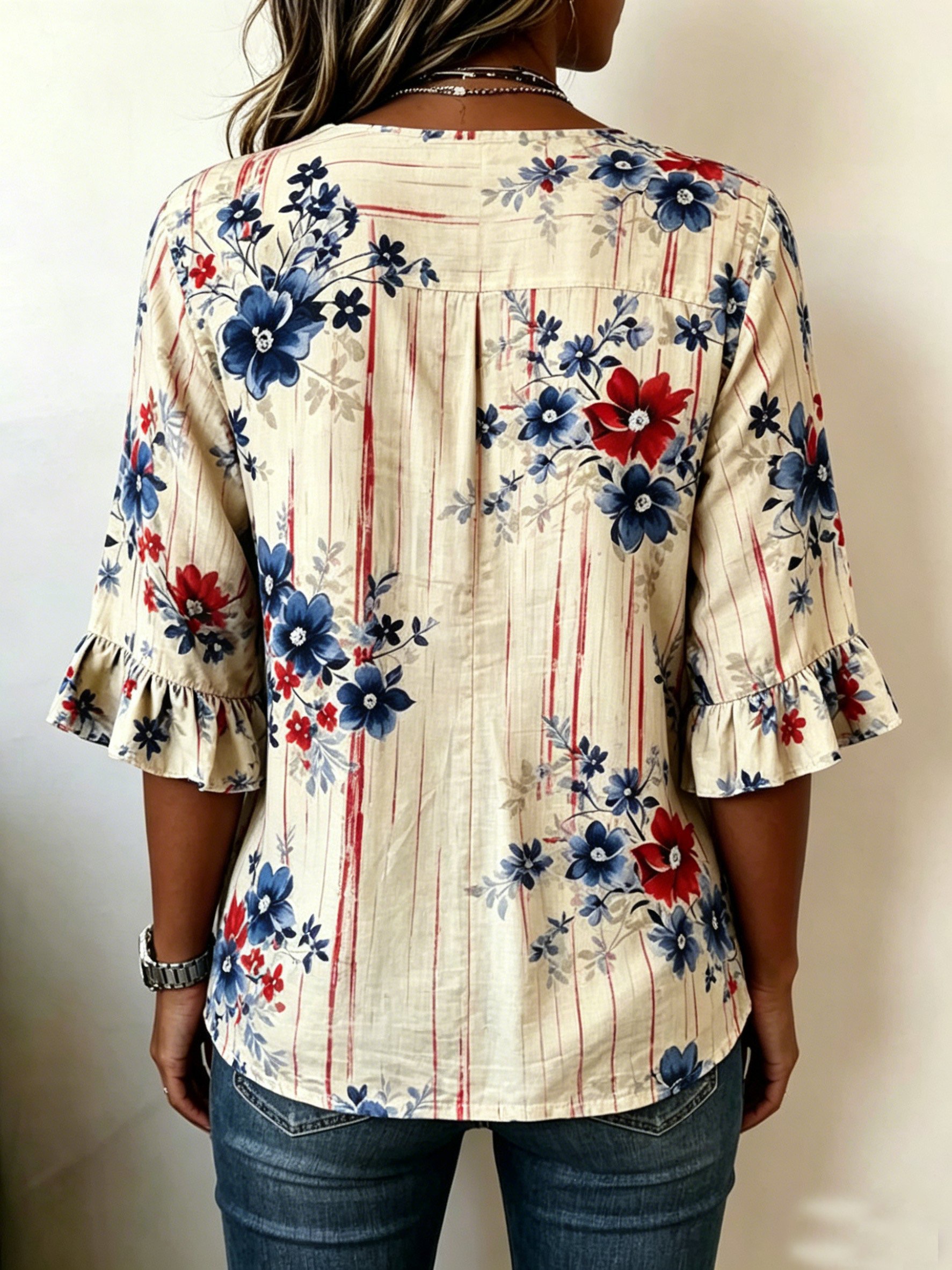 Women's Floral Half Sleeve Blouse Summer White Plain Peplum V Neck Button Daily Going Out Vintage Top Independence Day