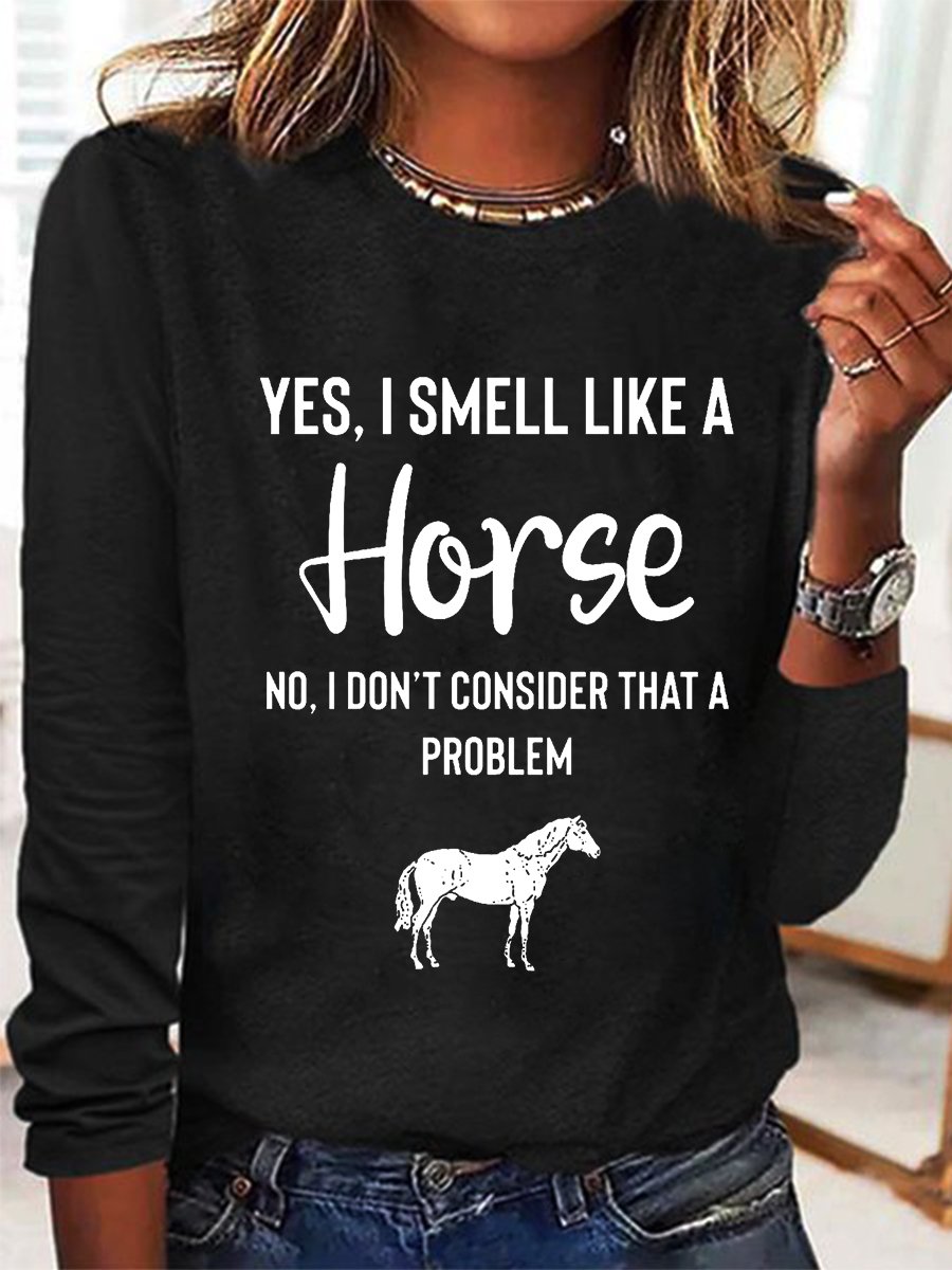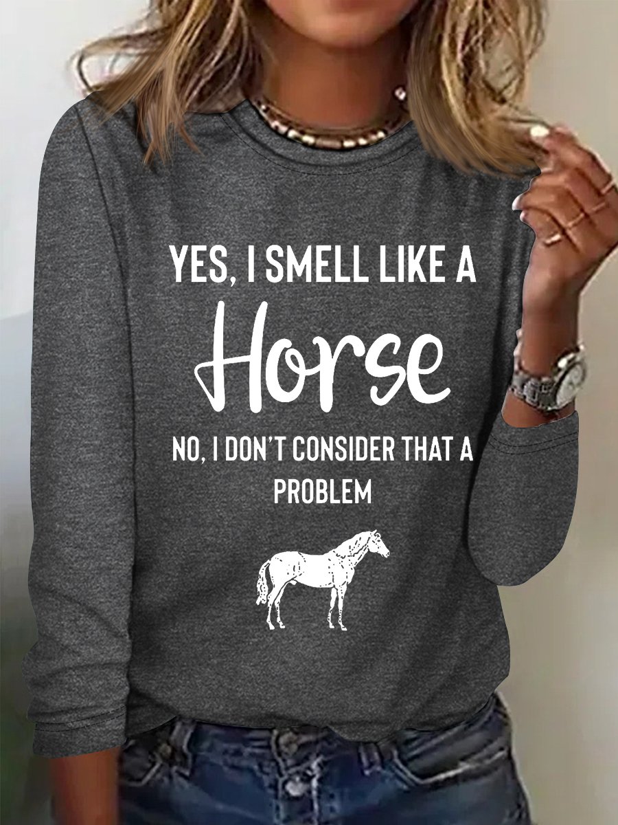 Women's Yes I Smell Like A Horse Animal Regular Fit Simple Crew Neck Long Sleeve Top