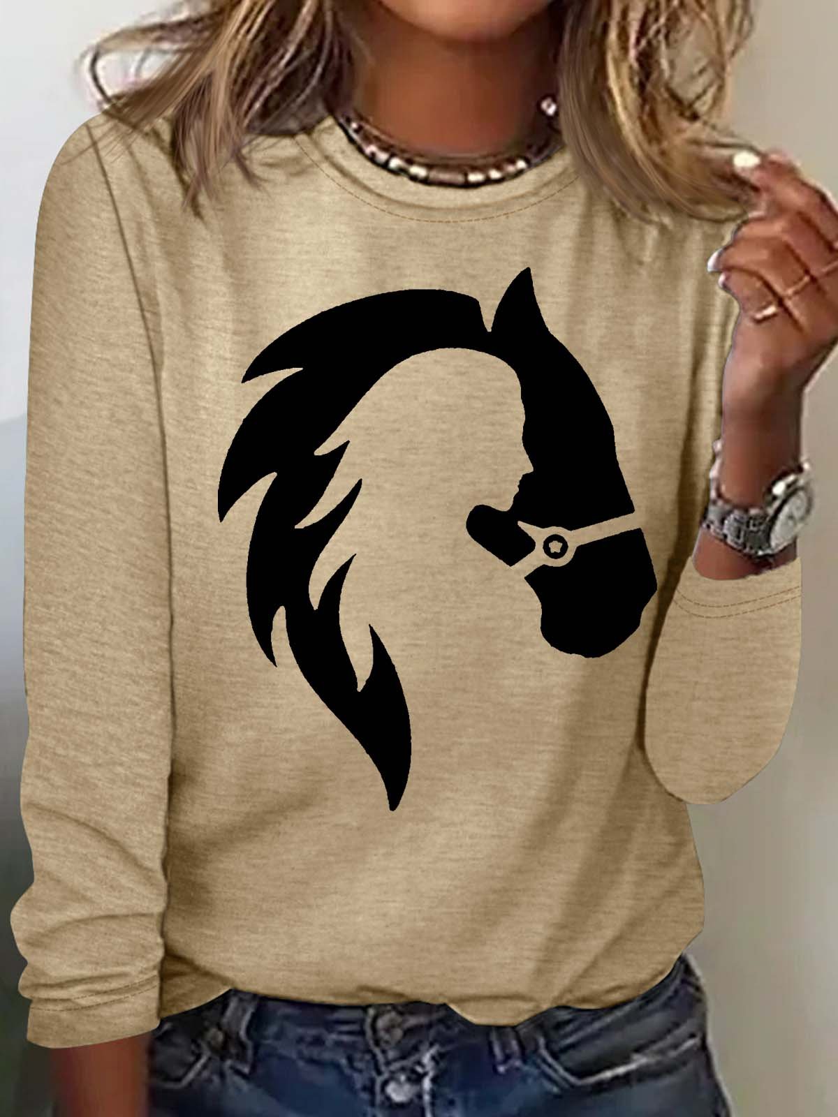 Women's Casual Horse Flowe Print Crew Neck Top