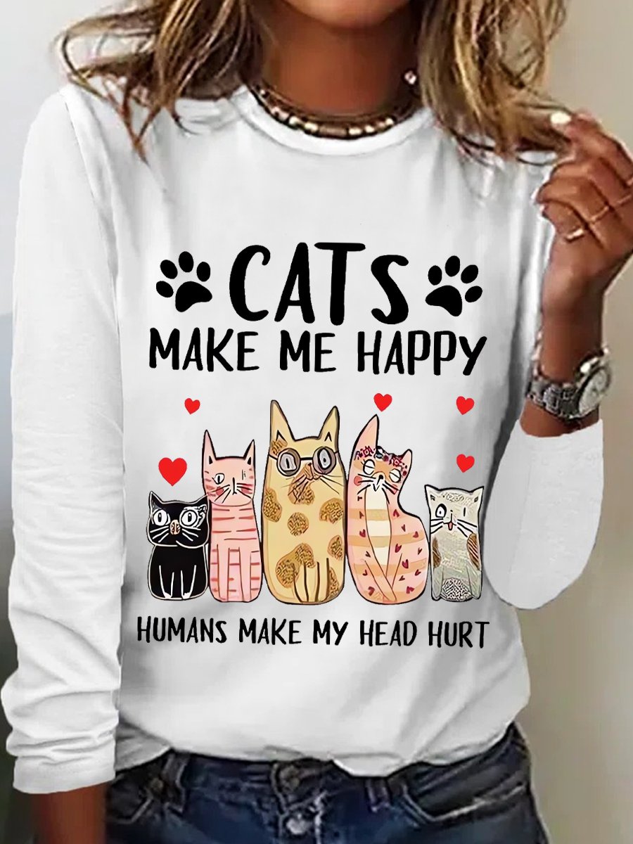 Women's Funny Word Cat Make Me Happy Simple Cotton-Blend Long Sleeve Top