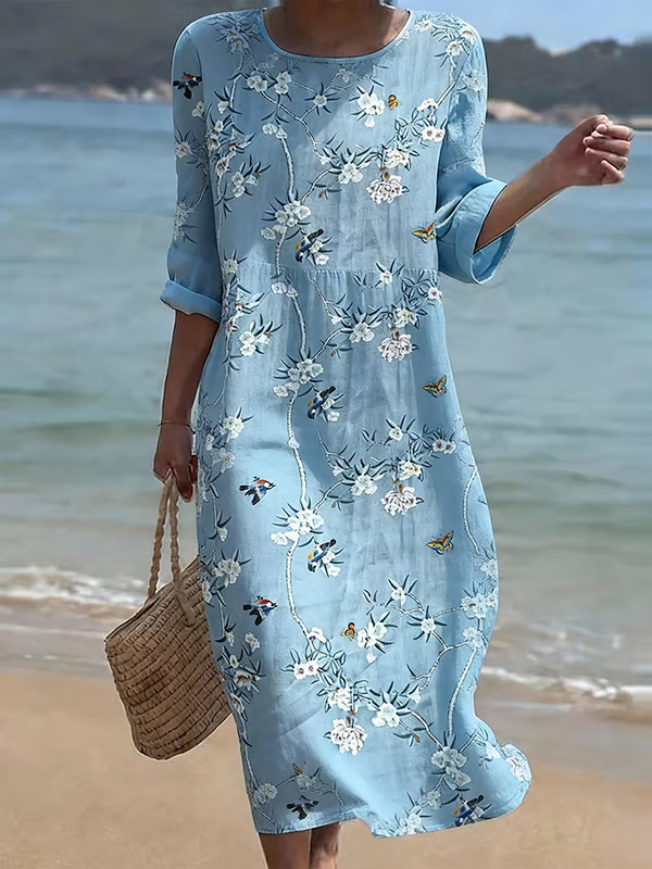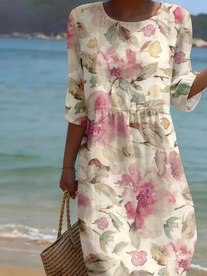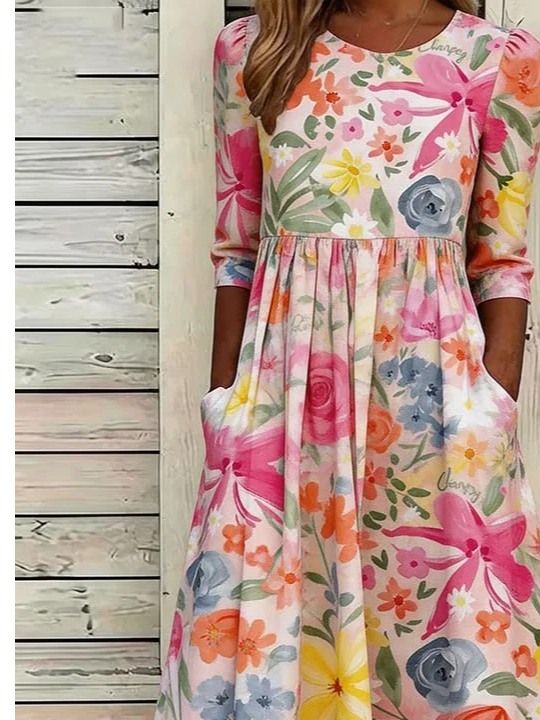 Loose Floral Elegant Crew Neck Dress With No