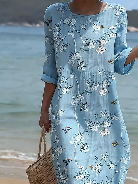 Crew Neck Loose Elegant Floral Dress With No
