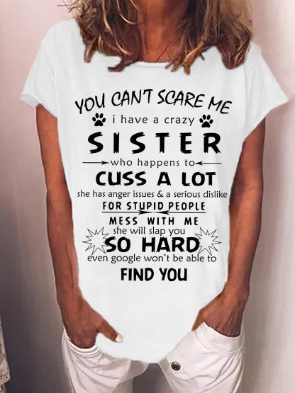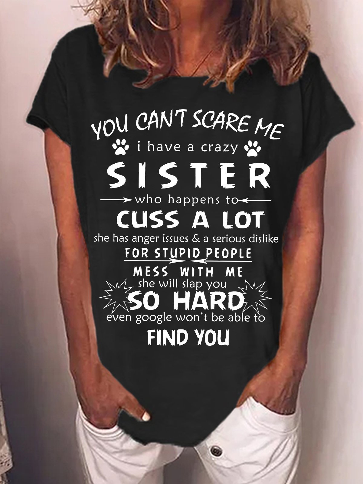 Women's You Can‘T Scare Me I Have A Crazy Sister Funny Graphic Printing Crew Neck Casual Cat Cotton T-Shirt