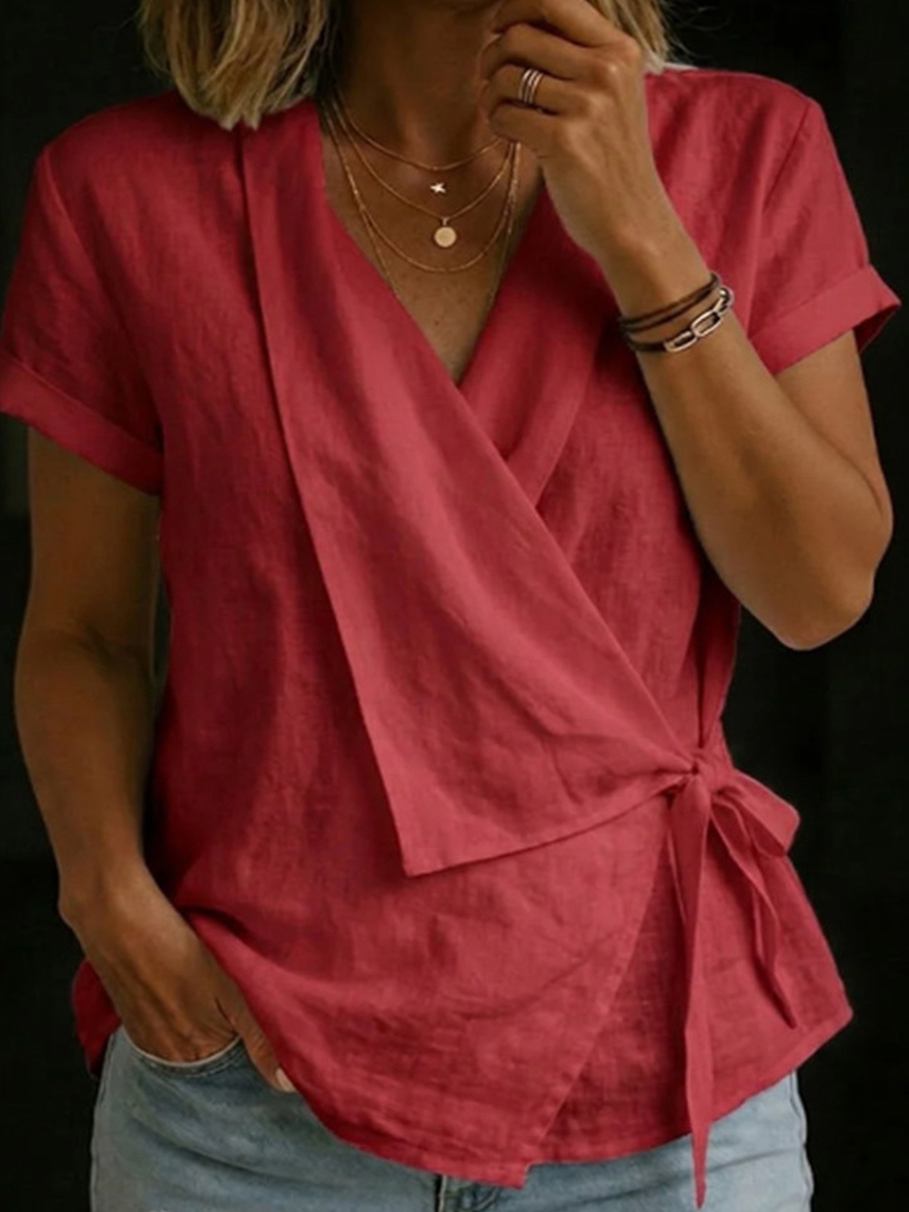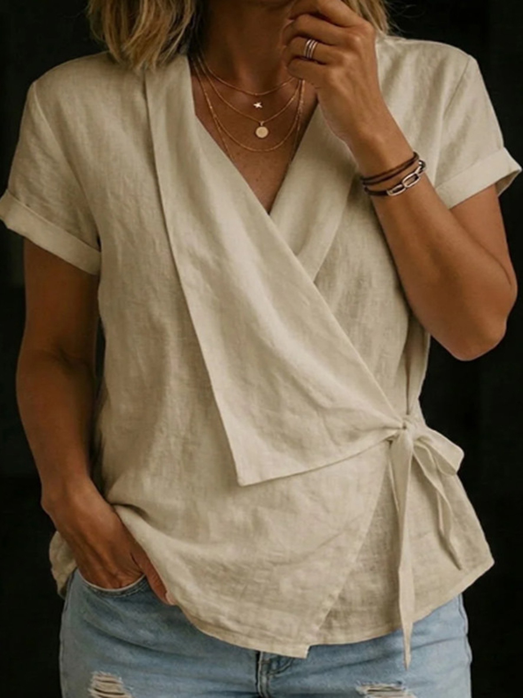 Cotton And Linen Wrap Detail V Neck Short Sleeve Irregularly Shaped Hem Casual Blouse
