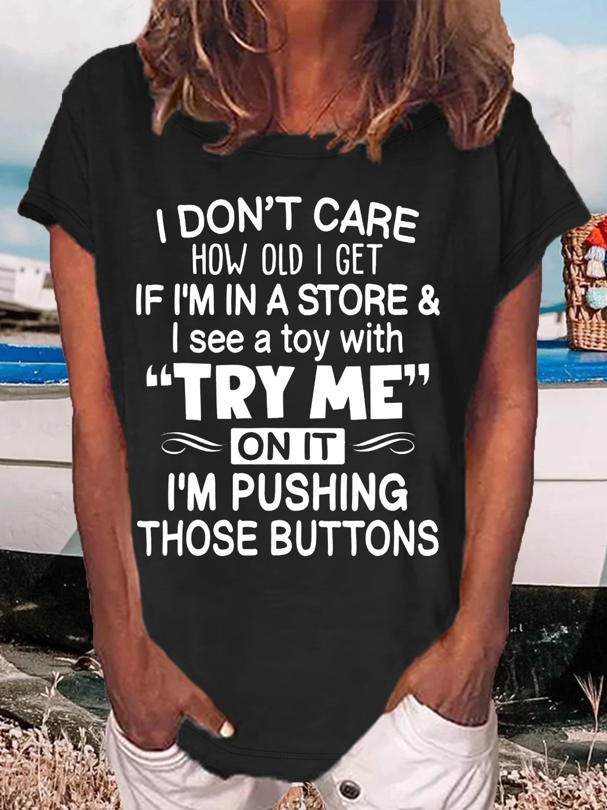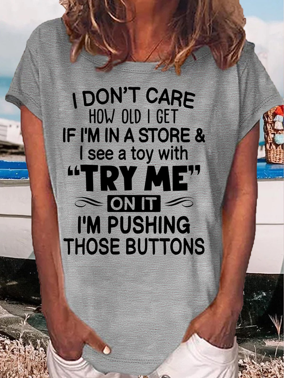 Women's I Don't Care How Old I Get If I'm In A Store Funny Crew Neck Casual T-Shirt