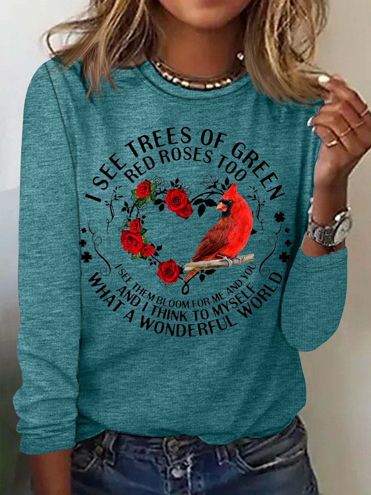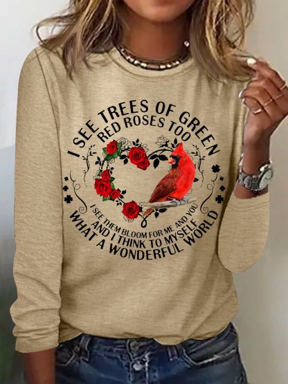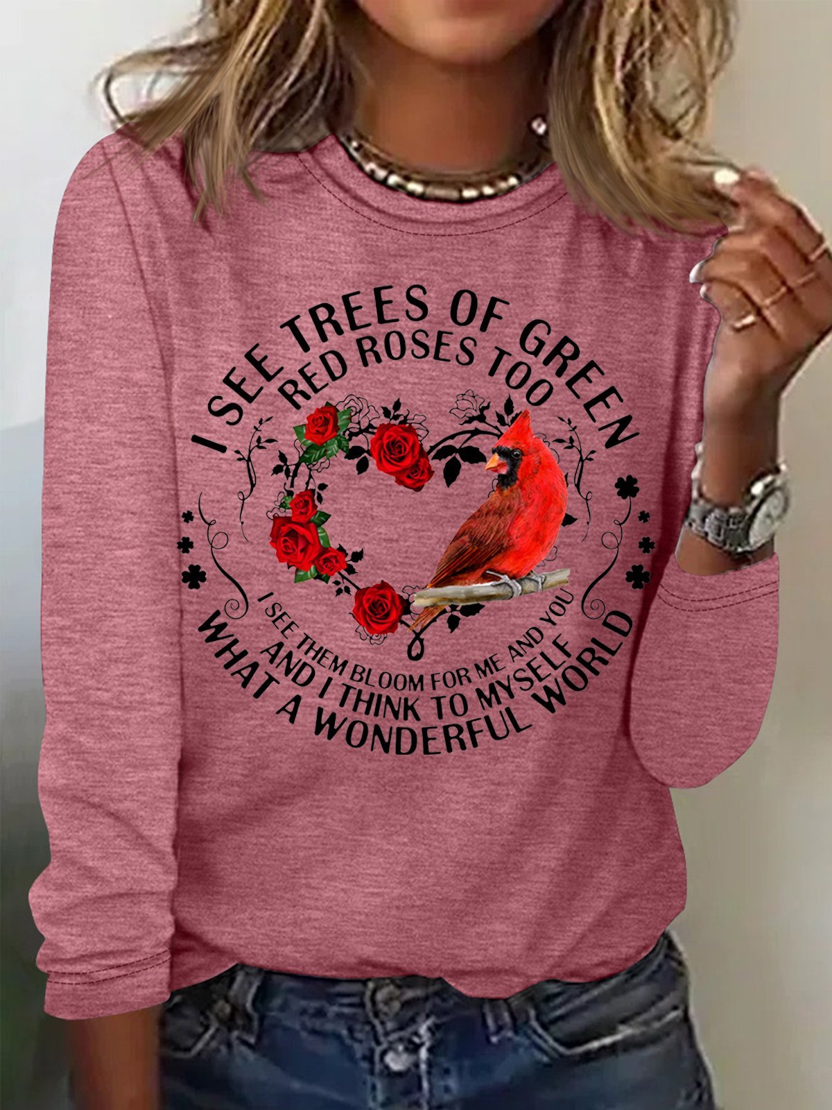 Women's Red Bird Letter Print Casual Crew Neck Top