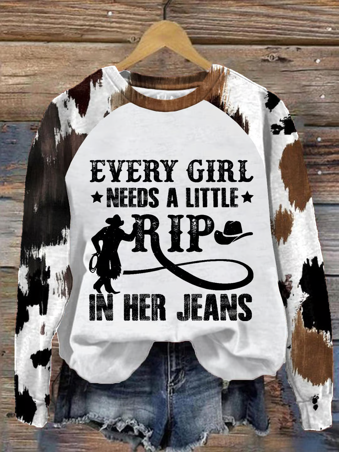 Women's Every Woman Needs A Little Rip In Her Jeans Print Round Neck Sweatshirt