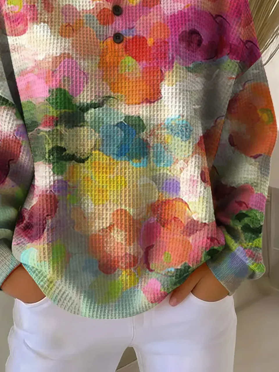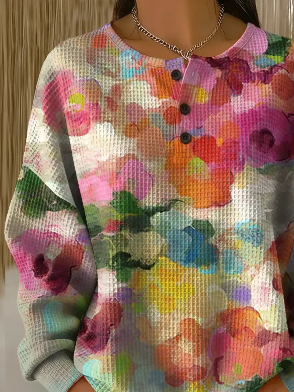 Women's Flowers Print Button-Up Casual Waffle Knit Sweatshirt